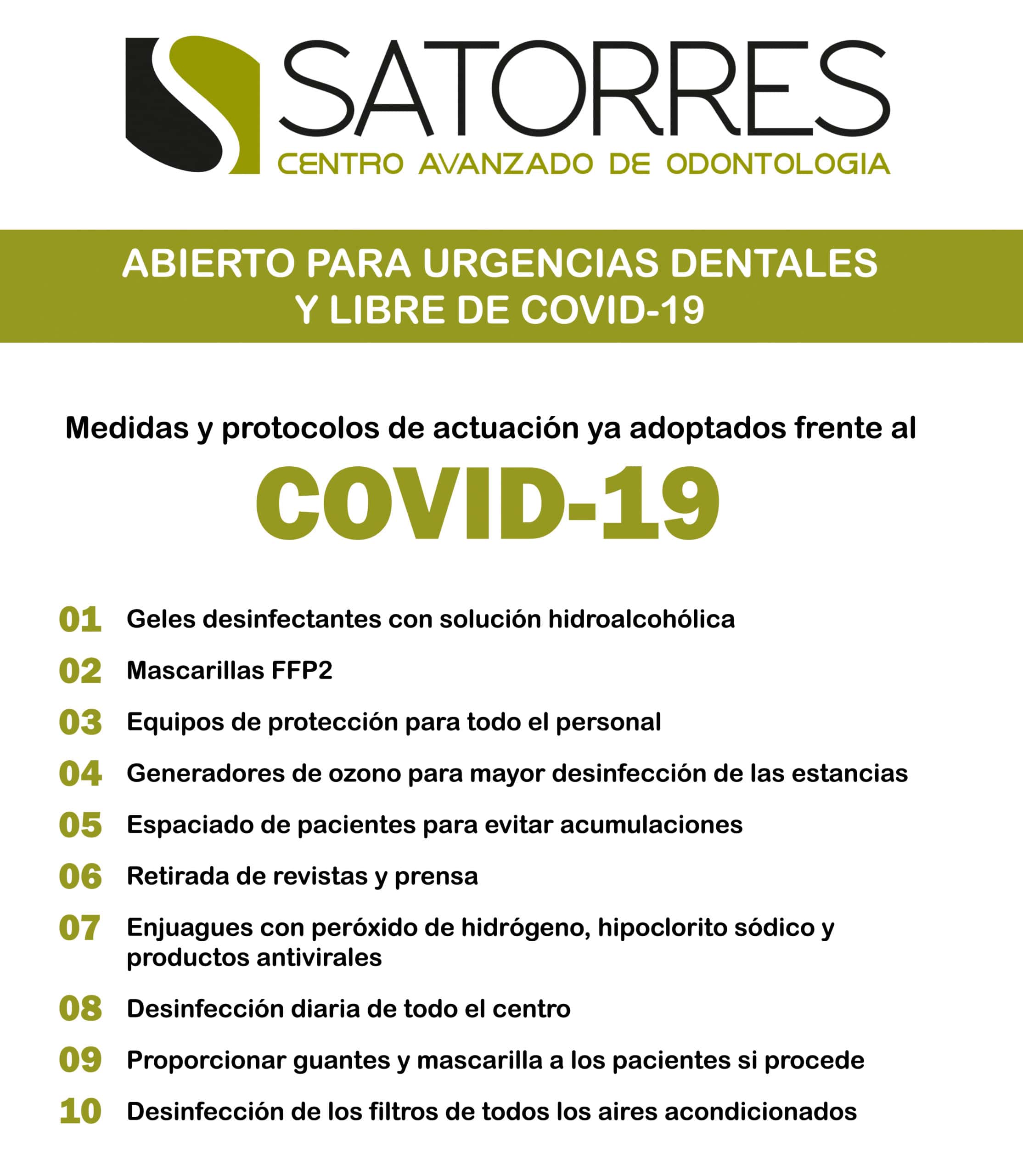 La Clínica Dental Satorres de Paterna y de Manises ha estado abierta en un horario fijo reducido para atender urgencias dentales, desde que se decretó el estado de alarma por la crisis sanitaria ocasionada por el coronavirus.